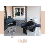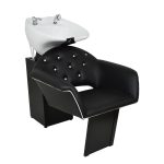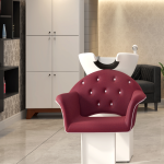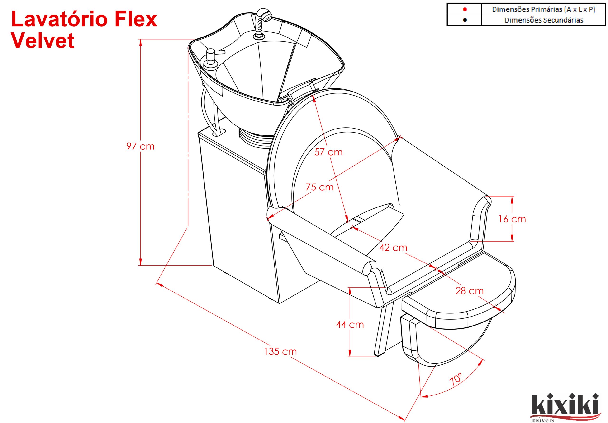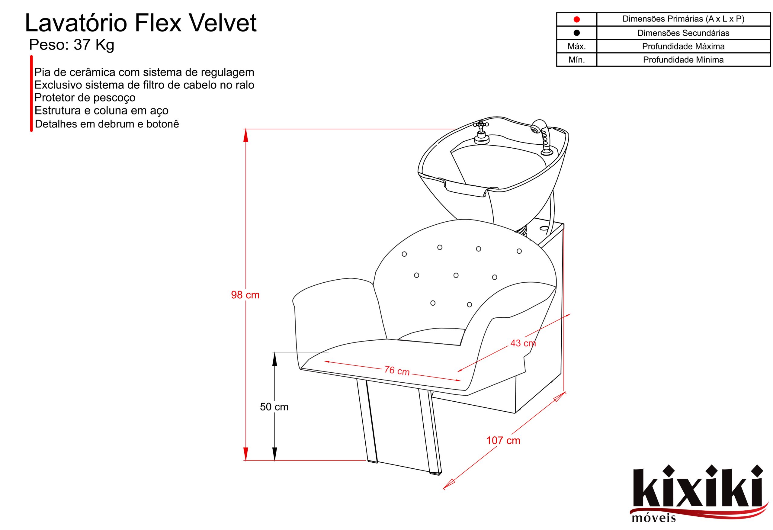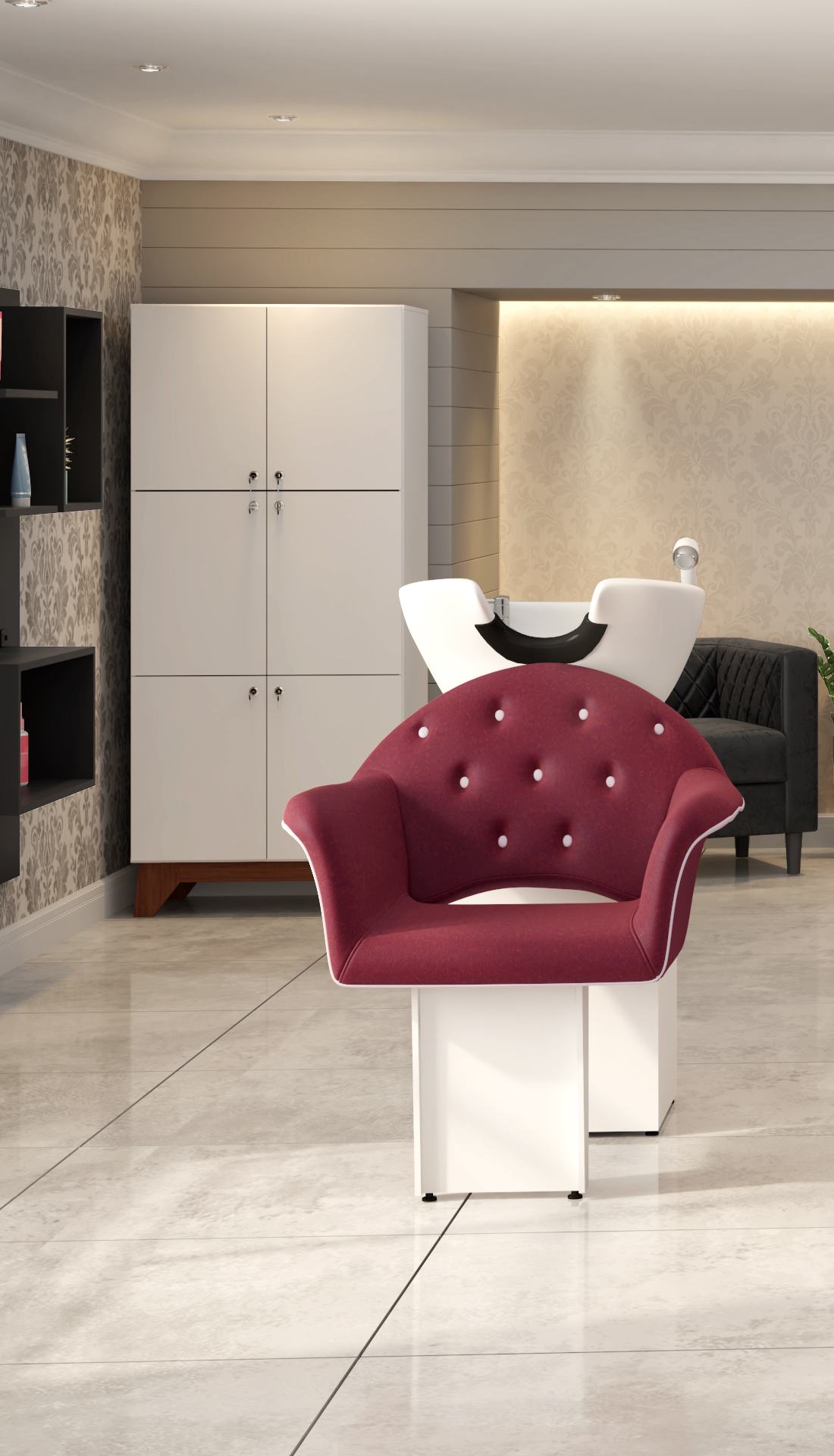 Lavatório para salão de beleza com encosto em detalhes em debrum e botonê. O posicionamento do assento e do encosto é todo voltado ao máximo conforto do cliente quando lavar o cabelo. Possui descanso de pernas acionado por alavanca.